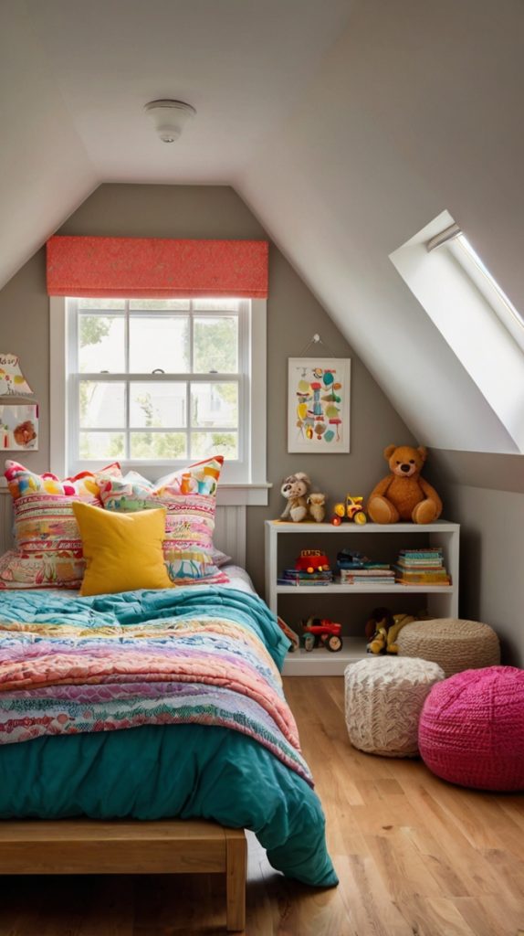Who says small spaces can’t handle color? Strategic pops of color bring personality without overwhelming your attic bedroom. The key word here is “strategic.”