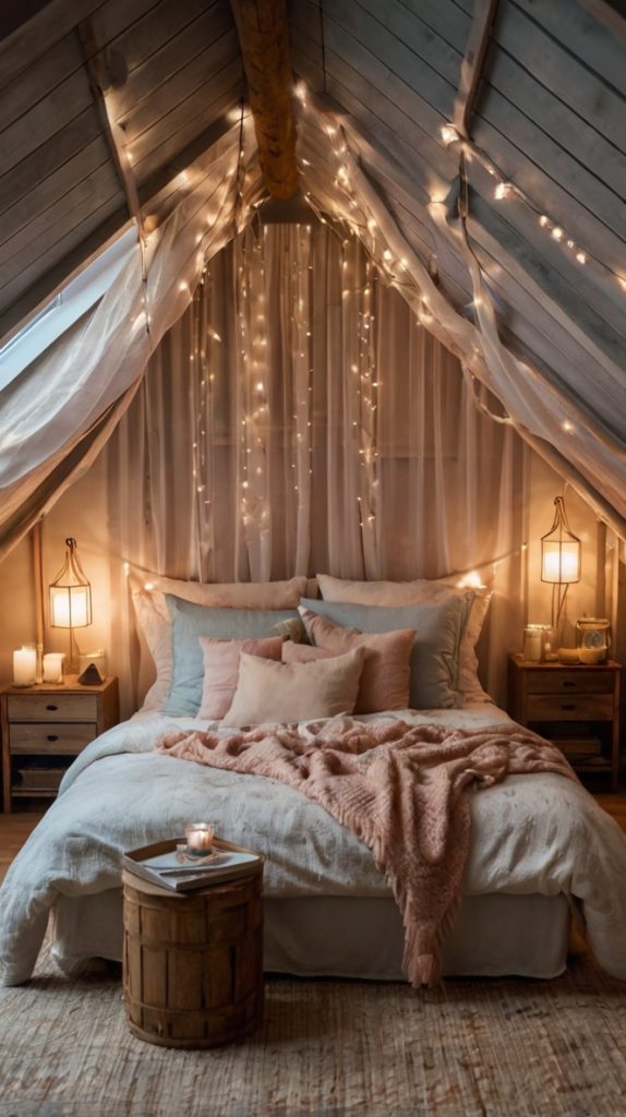 Soft, muted colors set the mood. Think blush pinks, warm grays, or deep jewel tones. Add a chandelier (yes, even in a small space) for instant elegance. I installed a small crystal chandelier in my attic bedroom, and everyone asks if I hired a designer.