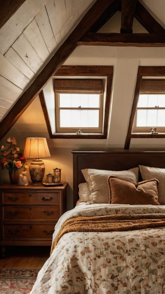 Vintage style in an attic bedroom feels like discovering grandma’s secret treasure room – in the best way possible. These spaces already have that old-house charm, so lean into it.