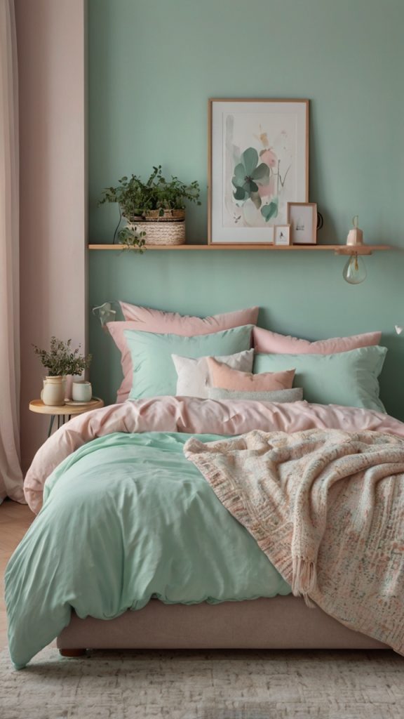 Soft sage green with white trim creates the most calming vibe – perfect for better sleep. Or try powder blue with cream accents if you want something more classic. The trick? Keep your color palette limited to 2-3 shades max. Too many colors in a small space feels chaotic.