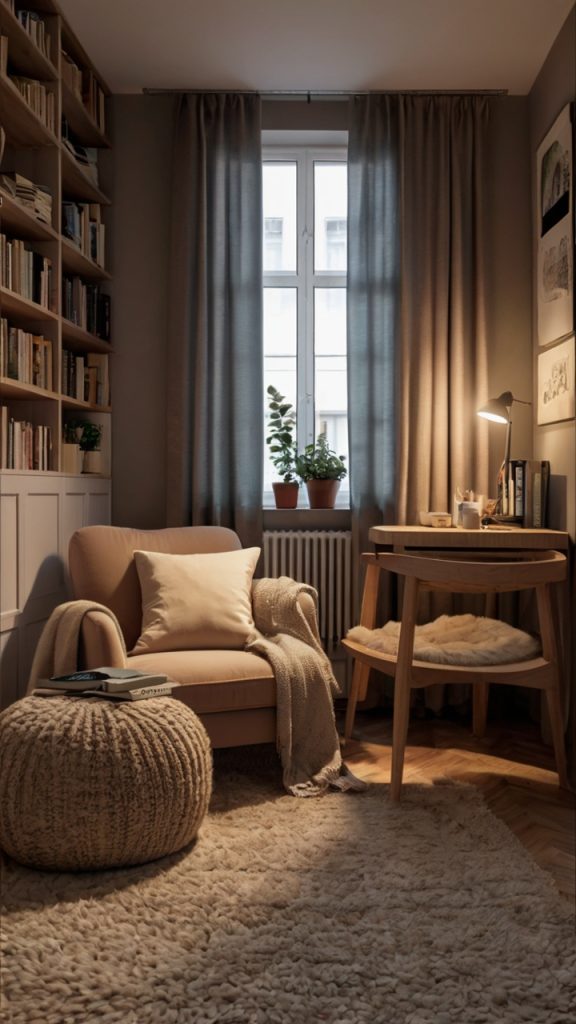 Good lighting makes or breaks a reading nook. I use a sleek floor lamp that arcs over my chair – it saves table space and looks super modern. Wall-mounted reading lights work great too if you’re really tight on floor space.