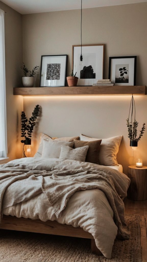 • Floating shelves above the headboard for books and decor