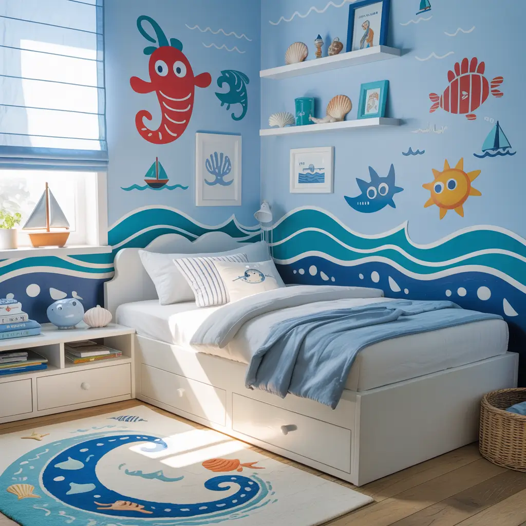 I helped design my nephew’s nautical room last summer, and we went all in with porthole mirrors, rope details, and a ship wheel on the wall. The coolest feature? We hung a fishing net across one corner of the ceiling and use it to store lightweight toys. Functional AND themed!