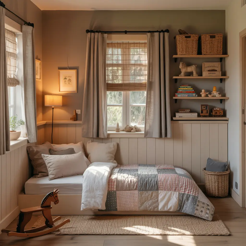 Rustic design in a boy’s room might seem unexpected, but hear me out. The farmhouse style is practically made for hiding messes – distressed furniture doesn’t show dings, natural textures hide dirt, and the whole aesthetic is supposed to look lived-in.