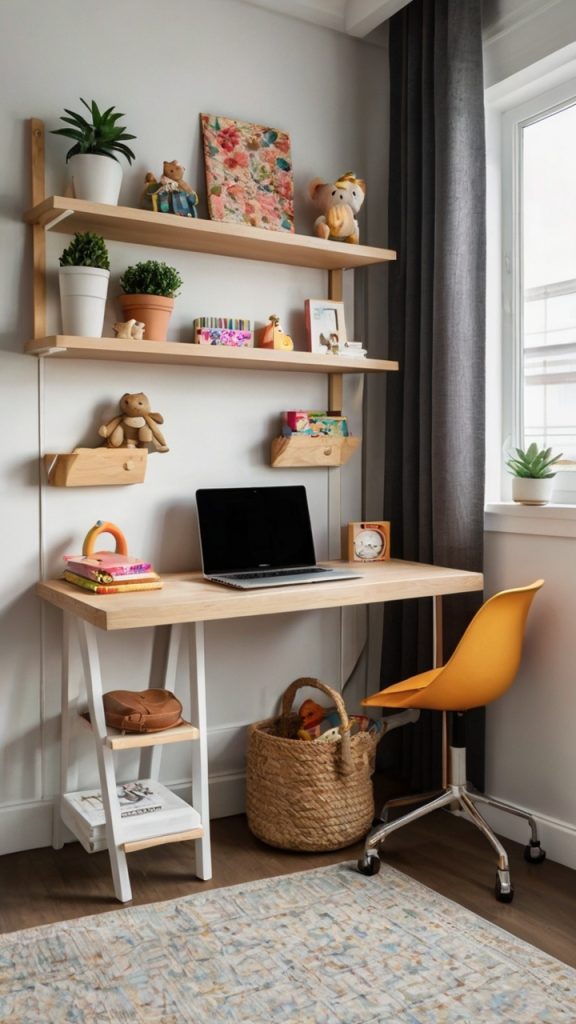 We installed a wall-mounted drop-leaf desk in my son’s room, and honestly, it’s brilliant. Homework time? Flip it down. Play time? Flip it up. The wall space above becomes a perfect spot for a bulletin board or shelving.