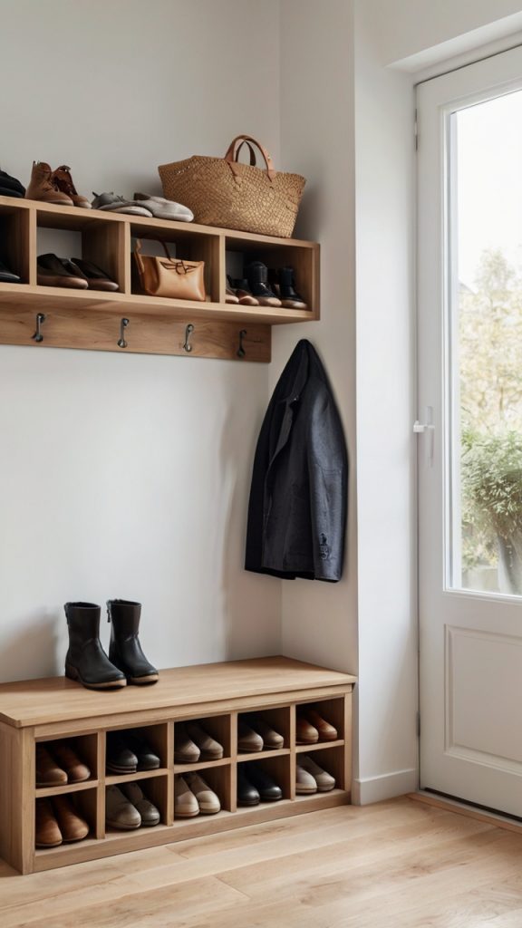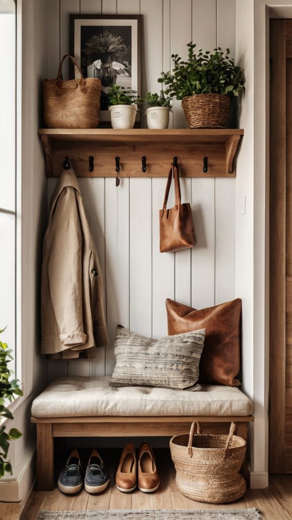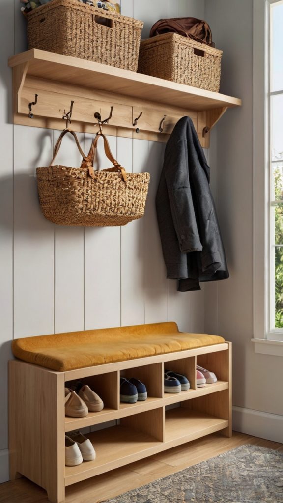 Don’t think you have room? Think again. I’ve seen people use narrow benches as slim as 12 inches deep that still provide seating and storage. Mount some hooks above it, and boom – you’ve got a complete mudroom setup in less than 2 feet of depth.