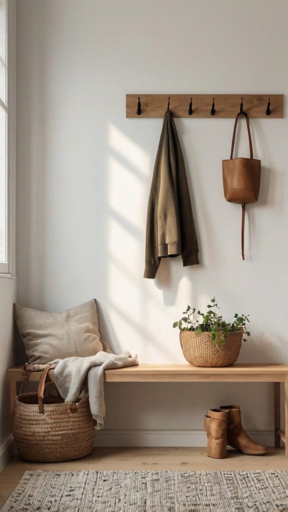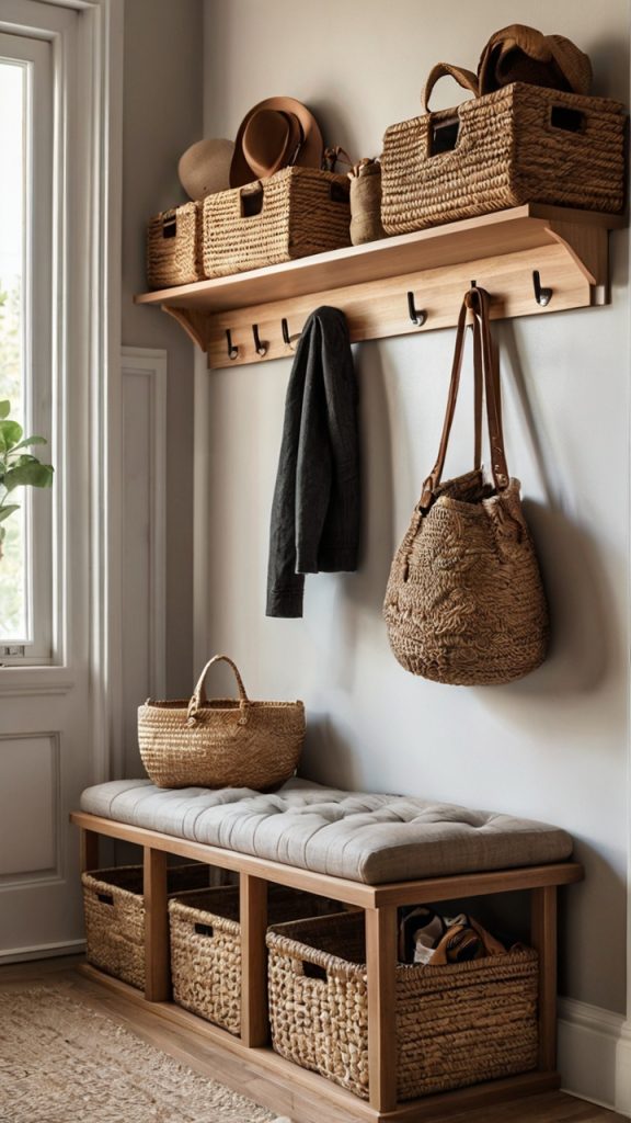 Never underestimate the power of pretty baskets. Woven storage baskets add warmth and texture while hiding all your entryway chaos. They’re basically camouflage for clutter.