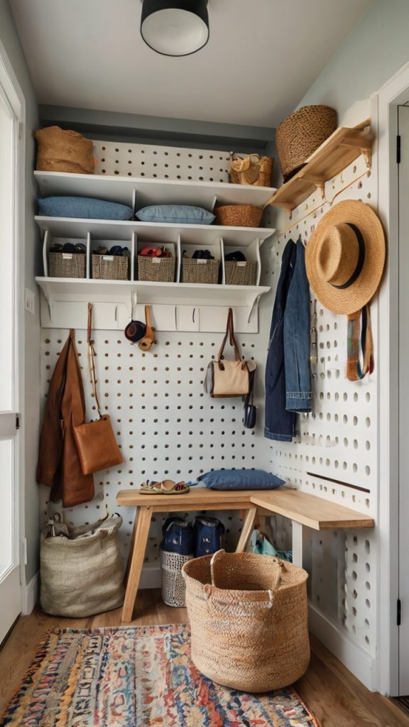 Who says pegboards are just for garages? Installing a pegboard wall in your mudroom opens up infinite customization possibilities. Seriously, it’s like adult LEGO for organization.