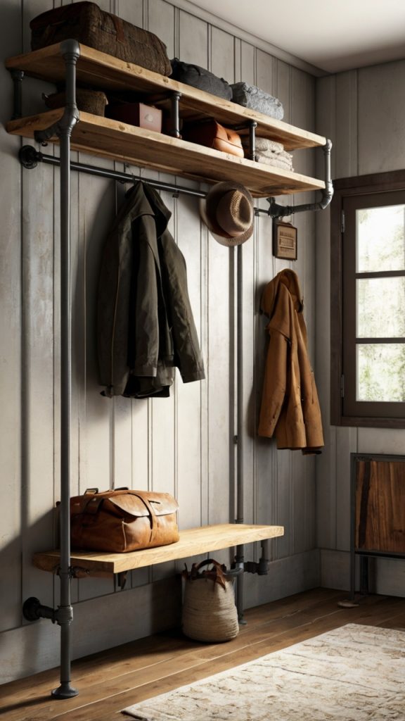 Industrial pipe shelving isn’t just trendy – it’s incredibly practical for small mudrooms. The combination of shelves and hanging bars creates a complete storage system that can handle serious weight.