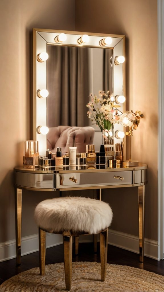 What makes corner vanities special is their ability to create a cozy beauty nook without dominating the room. Consider these elements:
