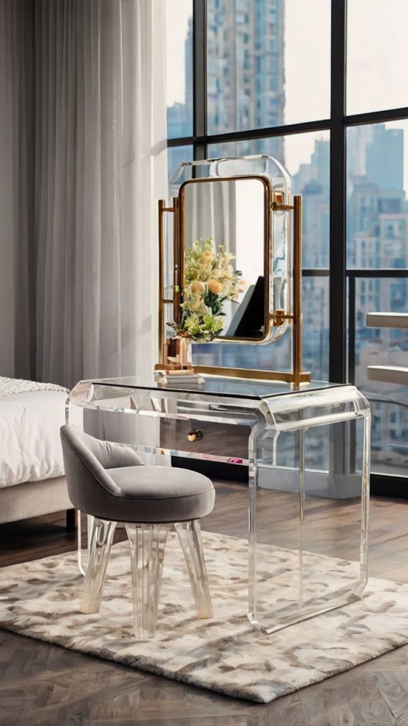 Acrylic furniture is basically invisible furniture, and in a small bedroom, that’s exactly what you want. Modern acrylic vanities create the illusion of more space because your eye travels right through them. It’s like having a vanity that’s there but not there.