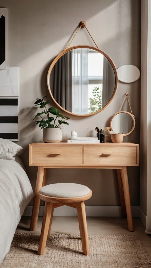 Scandinavian design and small spaces go together like coffee and mornings. The whole philosophy revolves around functional minimalism with a cozy twist, which is exactly what you need in a small bedroom vanity.
