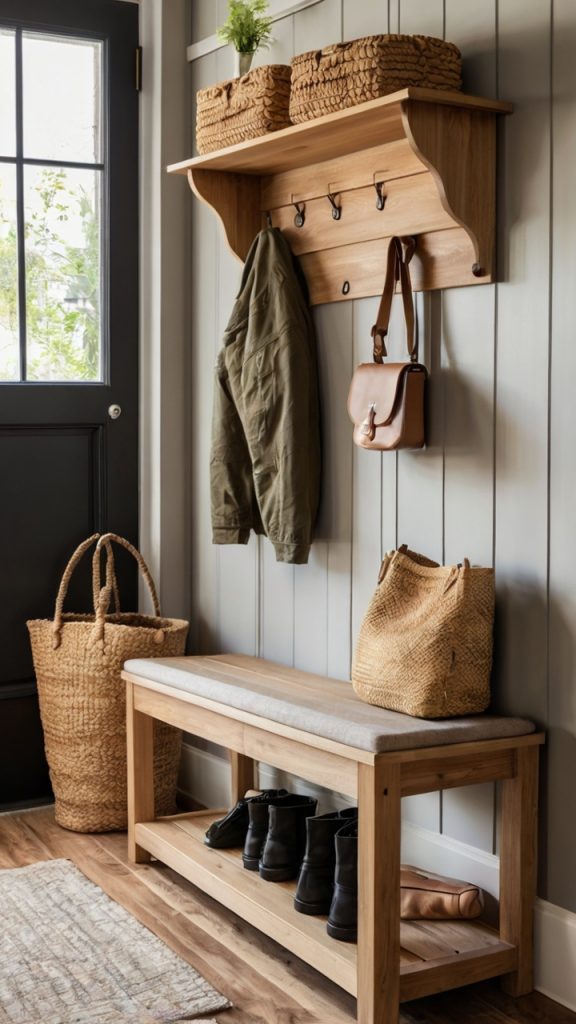 I transformed a bland corner with reclaimed wood shelves, vintage-style hooks, and a distressed bench I found at an estate sale. The worn textures hide everyday wear and tear while adding tons of personality. Plus, farmhouse style is forgiving – a little mess just adds to the “lived-in” charm.
