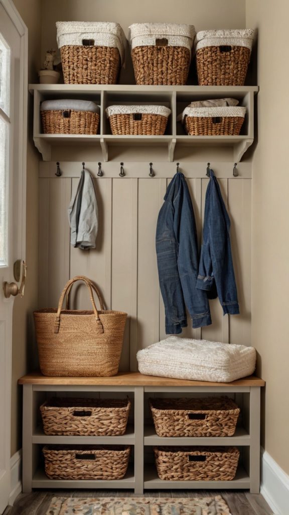 Matching baskets underneath create hidden storage for each family member. Label them (or don’t, if you like living dangerously), and suddenly everyone has their own spot for gloves, hats, and whatever else they dump by the door. My favorite part? When company comes over, everything looks intentional and organized, even if chaos lurks within those baskets.