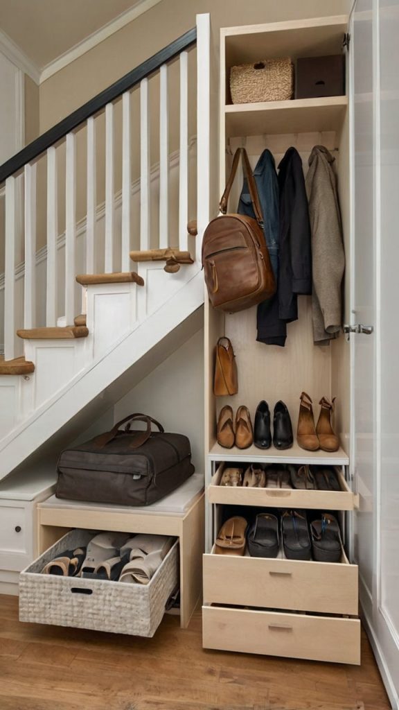 Got stairs near your entry? You’re sitting on a goldmine of storage potential! The space under stairs is practically begging to be utilized, and most of us just ignore it like that text from our ex.