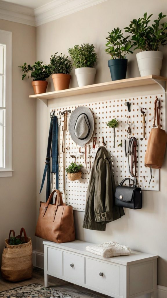 I installed a painted pegboard panel last spring, and honestly, it’s been a game-changer. The beauty lies in its flexibility – rearrange hooks, shelves, and baskets whenever your needs change. Winter means more hooks for scarves. Summer? Add baskets for sunglasses and sunscreen.