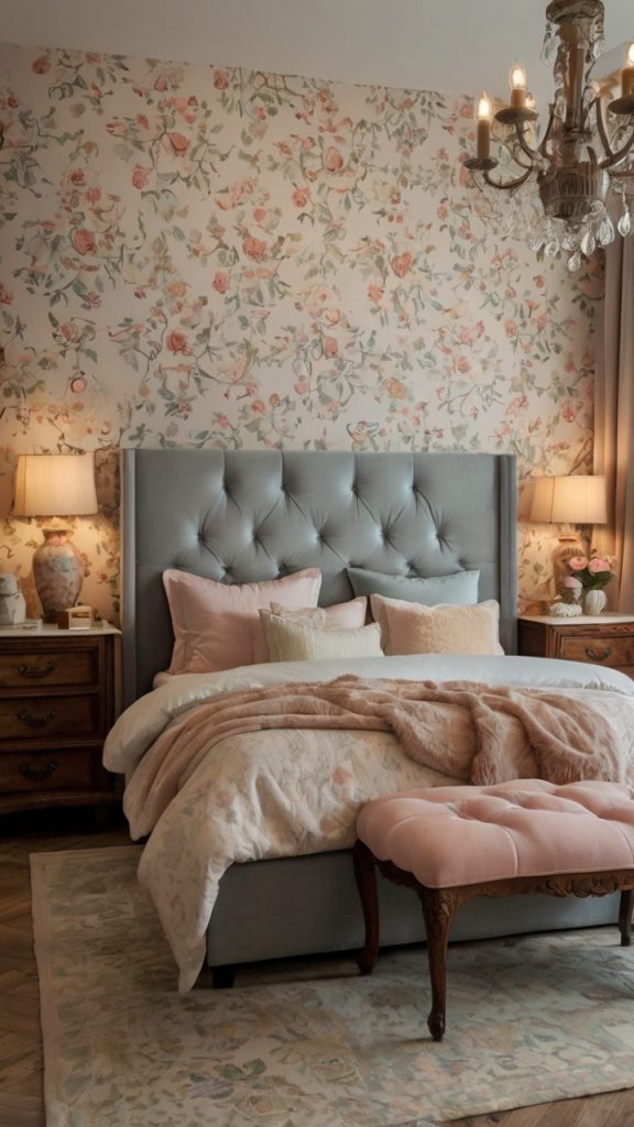 I suggest starting with an accent wall behind your headboard. This creates a stunning focal point without overwhelming the space. Choose patterns with medium to small-scale florals in muted colors for a refined look. My personal favorite? Chinoiserie-inspired designs that blend florals with birds and branches.