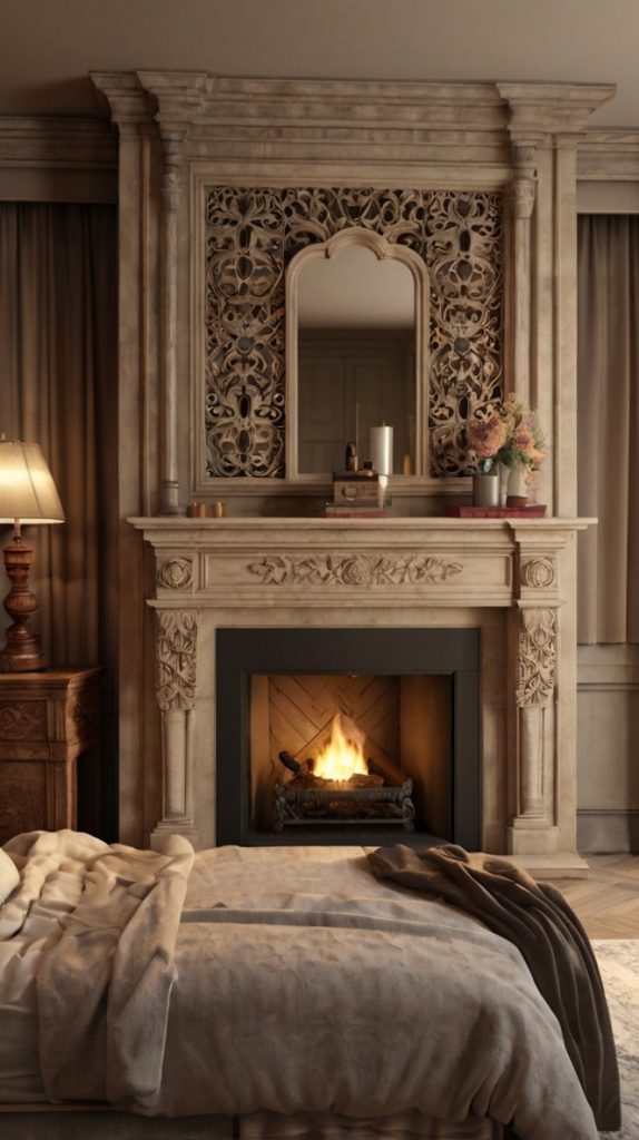 A bedroom fireplace represents the ultimate luxury in traditional decor. Even if you can’t have a working fireplace, the architectural element alone transforms a room.